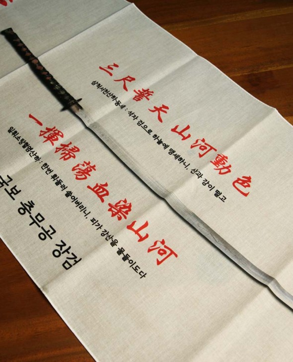 칼날에 “三尺誓天 山河動色 一揮掃蕩 血染山河“라는 친필 검명(劍銘)이 새겨져 있고,